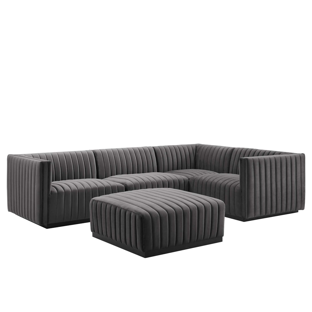 Modern appeal surrounds the Conjure Channel Tufted Performance Velvet Upholstered 5-Piece Sectional Sofa. Luxuriously soft, stain-resistant performance velvet upholstery covers dense foam padding and an individually wrapped spring coil system for a supportive living room sectional sofa that will become the go-to lounge spot for family and friends. Vertical channel tufting and subtle French piping adds depth to this vintage inspired sectional that effortlessly becomes the focal point in your living room. Solidly constructed from wood and plywood, this sofa features non-marking foot caps and boasts a matte black base. Versatile and elegant, this sectional sofa is ideally suited for a variety of decor styles in your living room, lounge, or home office. Each Seat Weight Capacity: 331 lbs. Set Includes: One - Conjure Channel Tufted Armless Chair One - Conjure Channel Tufted Left-Arm Chair One - Conjure Channel Tufted Ottoman One - Conjure Channel Tufted Right Corner Chair One - Conjure Channel Tufted Right-Arm Chair