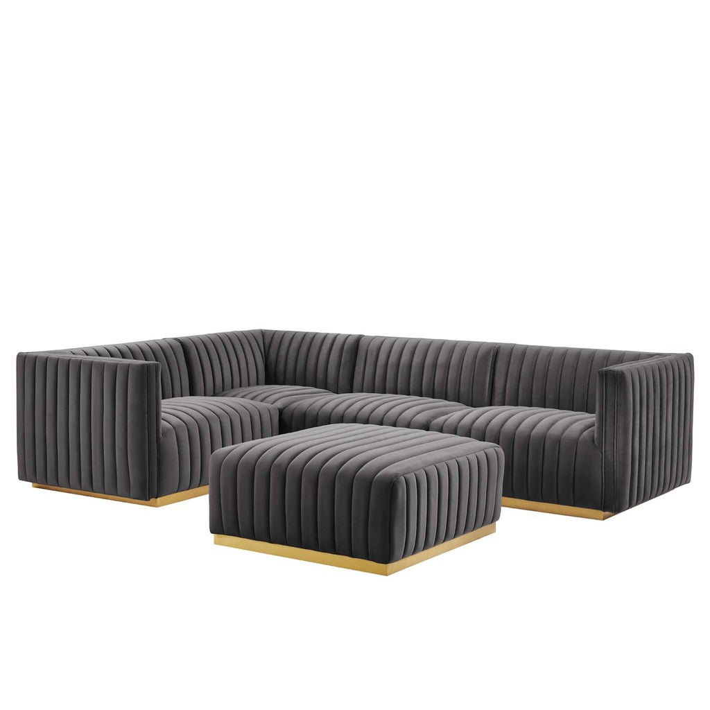Modern appeal surrounds the Conjure Channel Tufted Performance Velvet Upholstered 5-Piece Sectional Sofa. Luxuriously soft, stain-resistant performance velvet upholstery covers dense foam padding and an individually wrapped spring coil system for a supportive living room sofa that will become the go-to lounge spot for family and friends. Vertical channel tufting and subtle French piping adds depth to this vintage inspired sectional sofa that effortlessly becomes the focal point in your living room. Solidly constructed from wood and plywood, this sofa features non-marking foot caps and boasts a brushed gold stainless steel base. Versatile and elegant, this sectional sofa is ideally suited for a variety of decor styles in your living room, lounge, or home office. Each Seat Weight Capacity: 331 lbs. Set Includes: One - Conjure Channel Tufted Armless Chair One - Conjure Channel Tufted Left Corner Chair One - Conjure Channel Tufted Left-Arm Chair One - Conjure Channel Tufted Ottoman One - Conjure Channel Tufted Right-Arm Chair