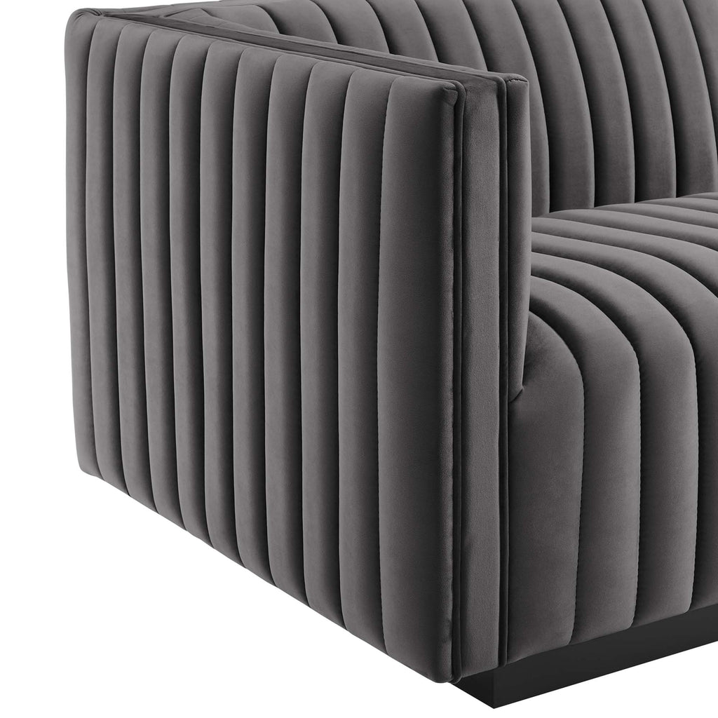 Modern appeal surrounds the Conjure Channel Tufted Performance Velvet Upholstered 6-Piece Sectional Sofa. Luxuriously soft, stain-resistant performance velvet upholstery covers dense foam padding and an individually wrapped spring coil system for a supportive living room sectional sofa that will become the go-to lounge spot for family and friends. Vertical channel tufting and subtle French piping adds depth to this vintage inspired sectional that effortlessly becomes the focal point in your living room. Solidly constructed from wood and plywood, this sofa features non-marking foot caps and boasts a matte black base. Versatile and elegant, this sectional sofa is ideally suited for a variety of decor styles in your living room, lounge, or home office. Each Seat Weight Capacity: 331 lbs. Set Includes: One - Conjure Channel Tufted Left-Arm Chair One - Conjure Channel Tufted Right-Arm Chair Two - Conjure Channel Tufted Armless Chair Two - Conjure Channel Tufted Ottoman