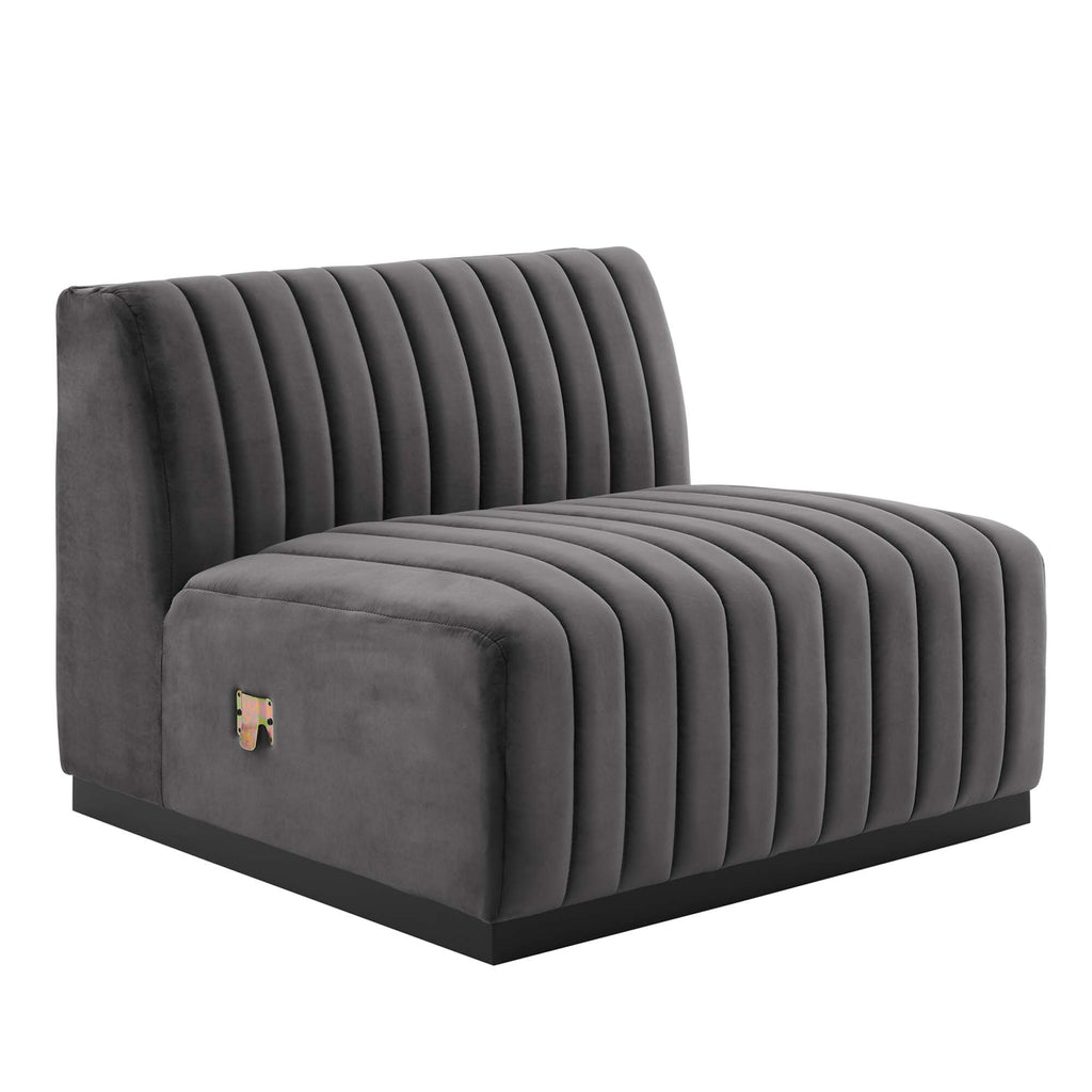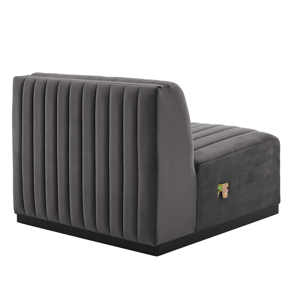 Modern appeal surrounds the Conjure Channel Tufted Performance Velvet Upholstered Armless Chair. Luxuriously soft, stain-resistant performance velvet upholstery covers dense foam padding and an individually wrapped spring coil system for a supportive living room chair that will become the go-to lounge spot for family and friends. Vertical channel tufting and subtle French piping adds depth to this vintage inspired sectional piece that effortlessly becomes the focal point in your living room. Solidly constructed from wood and plywood, this chair features non-marking foot caps and boasts a matte black base. Versatile and elegant, this sectional sofa piece is ideally suited for a variety of decor styles in your living room, lounge, or home office. Chair Weight Capacity: 331 lbs. Set Includes: One - Conjure Channel Tufted Armless Chair