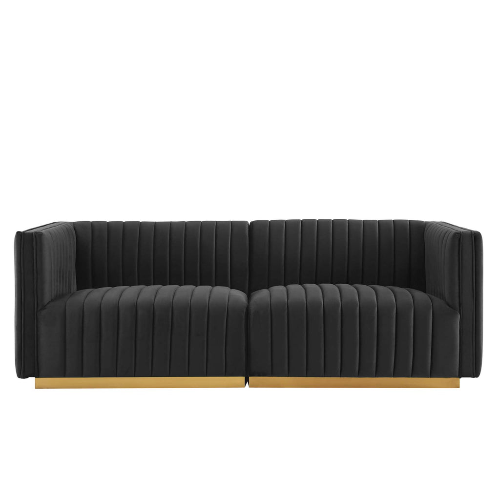 Modern appeal surrounds the Conjure Channel Tufted Performance Velvet Upholstered Loveseat. Luxuriously soft, stain-resistant performance velvet upholstery covers dense foam padding and an individually wrapped spring coil system for a supportive living room loveseat that will become the go-to lounge spot for family and friends. Vertical channel tufting and subtle French piping adds depth to this vintage inspired two-seater sofa that effortlessly becomes the focal point in your living room. Solidly constructed from wood and plywood, this loveseat features non-marking foot caps and boasts a brushed gold stainless steel base. Versatile and elegant, this sectional loveseat is ideally suited for a variety of decor styles in your living room, lounge, or home office. Each Seat Weight Capacity: 331 lbs. Set Includes: One - Conjure Channel Tufted Left-Arm Chair One - Conjure Channel Tufted Right-Arm Chair