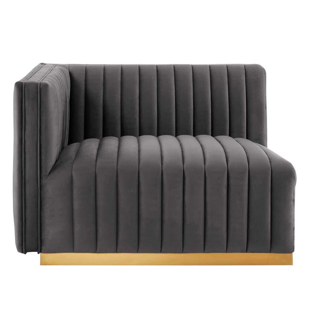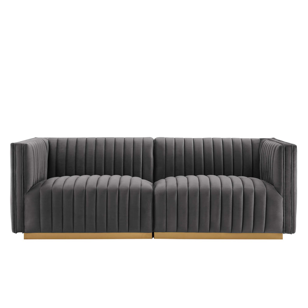 Modern appeal surrounds the Conjure Channel Tufted Performance Velvet Upholstered Loveseat. Luxuriously soft, stain-resistant performance velvet upholstery covers dense foam padding and an individually wrapped spring coil system for a supportive living room loveseat that will become the go-to lounge spot for family and friends. Vertical channel tufting and subtle French piping adds depth to this vintage inspired two-seater sofa that effortlessly becomes the focal point in your living room. Solidly constructed from wood and plywood, this loveseat features non-marking foot caps and boasts a brushed gold stainless steel base. Versatile and elegant, this sectional loveseat is ideally suited for a variety of decor styles in your living room, lounge, or home office. Each Seat Weight Capacity: 331 lbs. Set Includes: One - Conjure Channel Tufted Left-Arm Chair One - Conjure Channel Tufted Right-Arm Chair