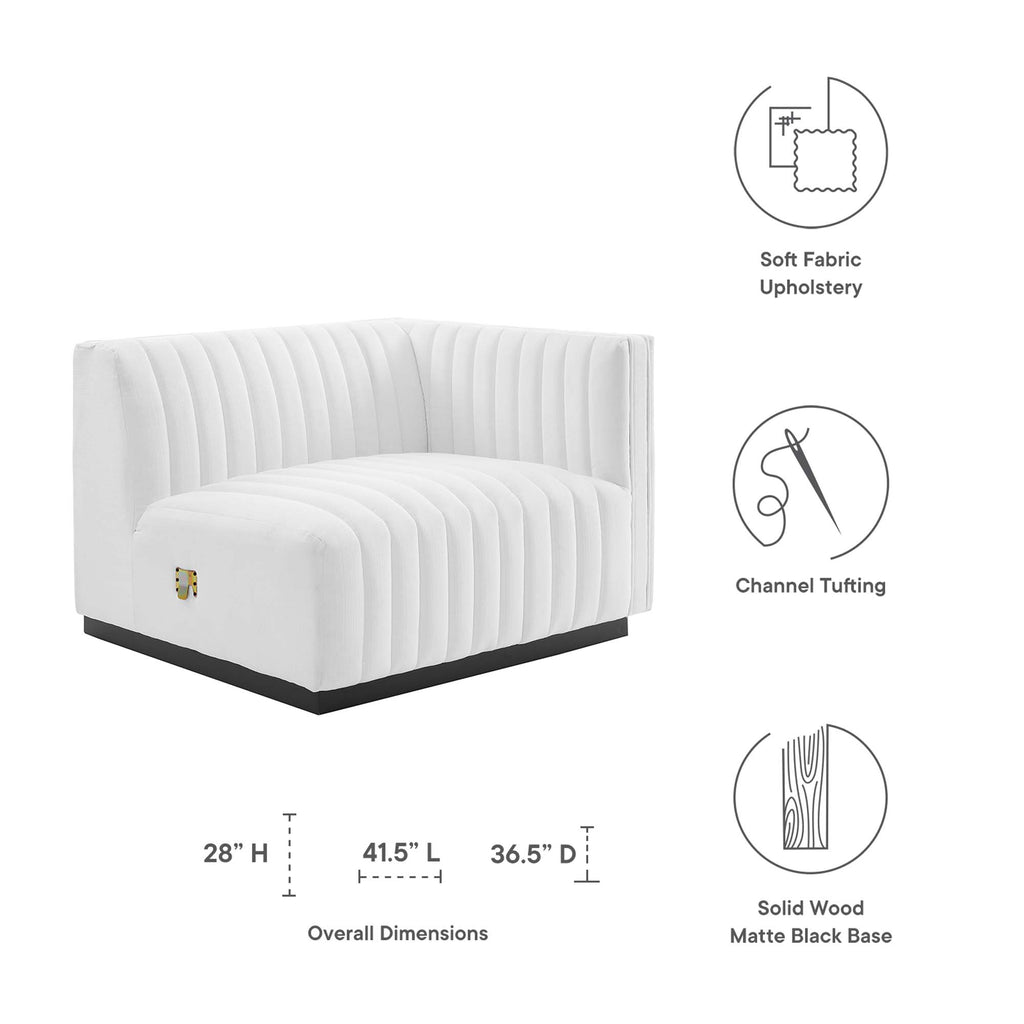 Modern appeal surrounds the Conjure Channel Tufted Upholstered Fabric Right-Arm Chair. Soft and durable fabric upholstery covers dense foam padding and an individually wrapped spring coil system for a supportive living room chair that will become the go-to lounge spot for family and friends. Vertical channel tufting and subtle French piping adds depth to this vintage inspired sectional piece that effortlessly becomes the focal point in your living room. Solidly constructed from wood and plywood, this armchair features non-marking foot caps and boasts a matte black base. Versatile and elegant, this sectional sofa piece is ideally suited for a variety of decor styles in your living room, lounge, or home office. Chair Weight Capacity: 331 lbs. Set Includes: One - Conjure Channel Tufted Upholstered Fabric Right-Arm Chair