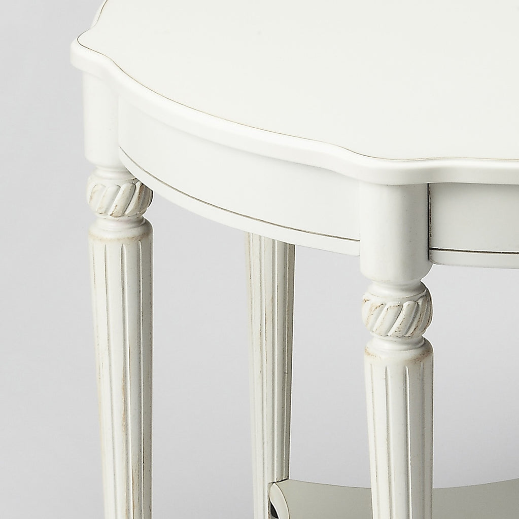 A timeless beauty indeed, the Cottage White Accent Table is a perfect blend of ancient and modern designs put together. Crafted with sophistication from various hardwood solids, wood products and birch veneer it has a round top and unique lower shelf which resembles a six-point star for ample storage and display. The entire structure is rested upon four fluted tapered legs which have been elegantly carved to highlight it's presence. The cottage white smooth finish completes the entire look of the table making it ideal and compatible in any set up. 28" x 28" x 28"