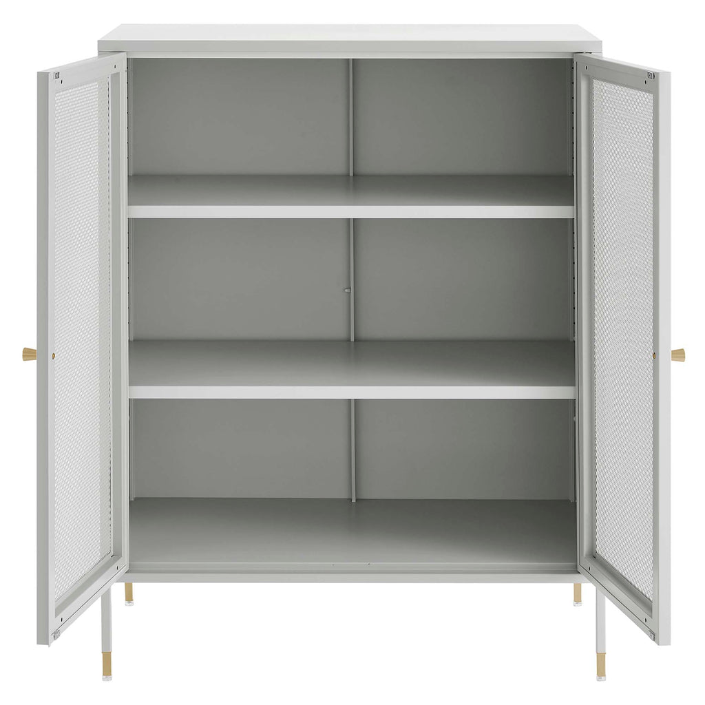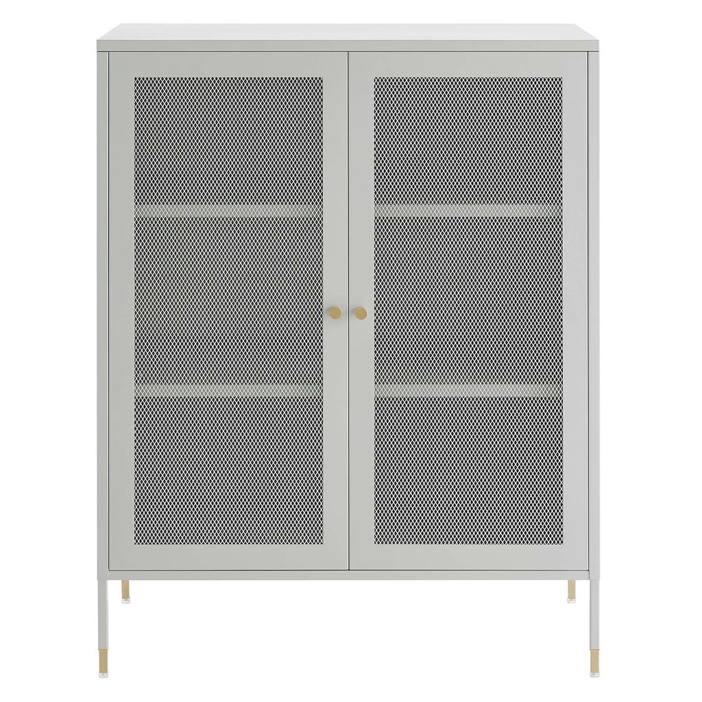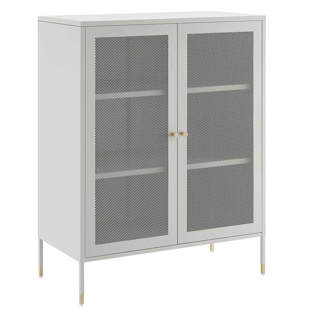 Elevate your home decor and storage needs with the Covelo Accent Storage Cabinet. Crafted with durable cold-rolled steel plates with powder-coated paint, this storage cabinet is built to last. The copper-plated zinc alloy handle pulls and mesh-front doors add a touch of elegance and modern interest to its surroundings. On the inside of this accent cabinet, you'll find two spacious height-adjustable shelves behind magnet close doors. Anti-tipping hardware is included for added safety. The adjustable foot pads protect your flooring from scratches and damage while ensuring stability. Perfect for entryways, living rooms, kitchens, home offices, or dining rooms, our accent cabinet offers a stylish and functional storage solution to suit your needs. Assembly required. Set Includes: One - Covelo 32" Accent Cabinet