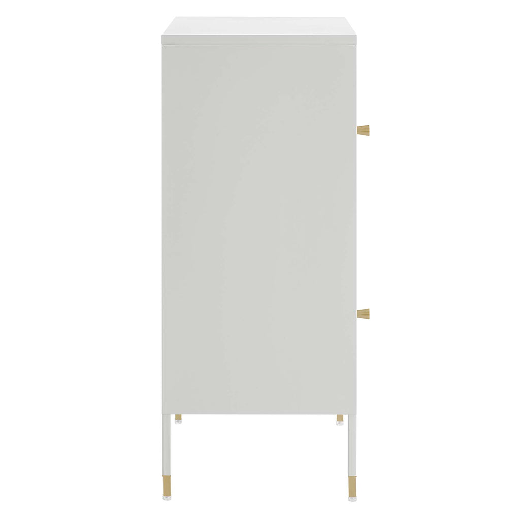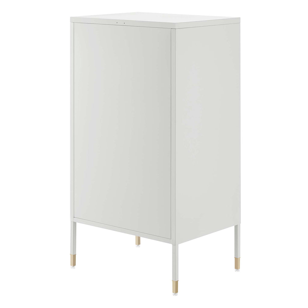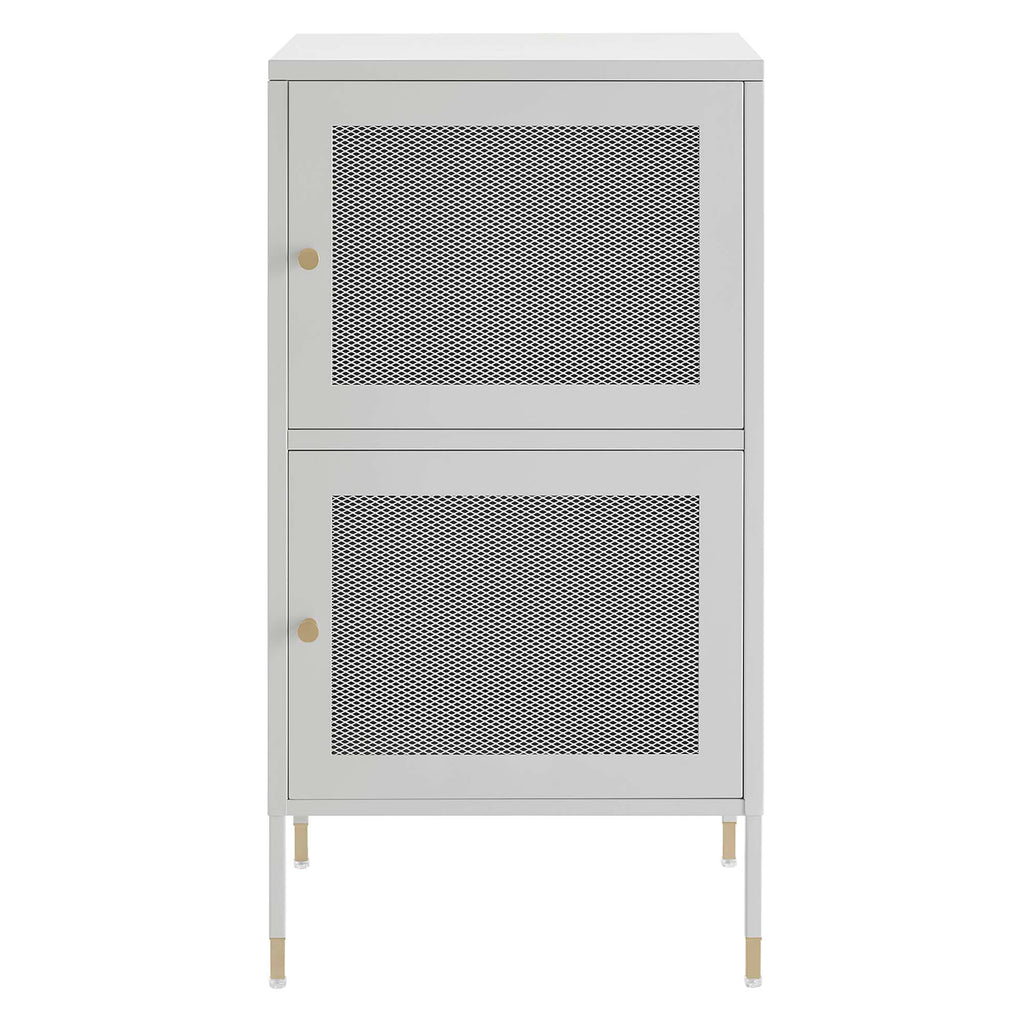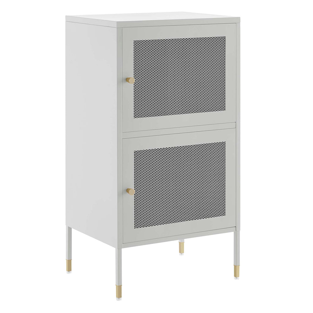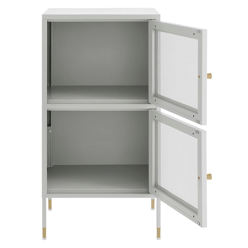 Elevate your home decor and storage needs with the Covelo Accent Storage Cabinet. Crafted with durable cold-rolled steel plates with powder-coated paint, this storage cabinet is built to last. The copper-plated zinc alloy handle pulls and mesh-front doors add a touch of elegance and modern interest to its surroundings. On the inside of this accent cabinet, you'll find two spacious storage areas behind magnet close doors. Anti-tipping hardware is included for added safety. The adjustable foot pads protect your flooring from scratches and damage while ensuring stability. Perfect for living rooms, entryways, kitchens, or bathrooms, this accent cabinet offers stylish and functional storage space to suit your needs. Assembly required. Set Includes: One - Covelo 33" Accent Cabinet