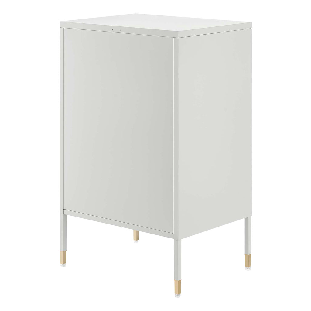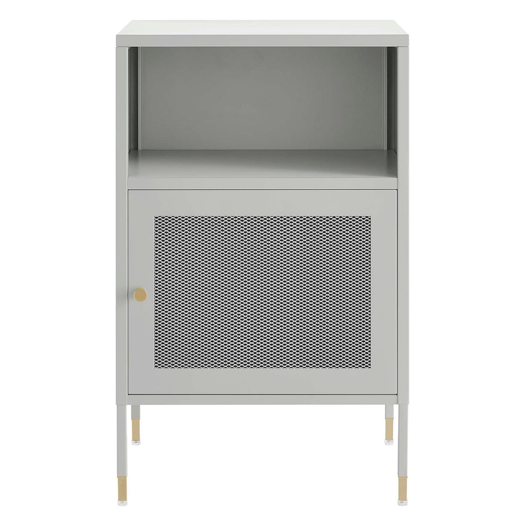 Elevate your living space decor and storage needs with the Covelo Side Table. Crafted with durable cold-rolled steel plates with powder-coated paint, this end table is built to last. The copper-plated zinc alloy handle pull and mesh-front door adds a touch of elegance and modern interest to its surroundings. On the inside of this accent table, you'll find an open display shelf and a spacious storage area behind a magnet close door. Anti-tipping hardware is included for added safety. The adjustable foot pads protect your flooring from scratches and damage while ensuring stability. Perfect for the living room, lounge area, or other seating space, this storage side table offers stylish and functional storage space to suit your needs. Assembly required. Set Includes: One - Covelo Side Table