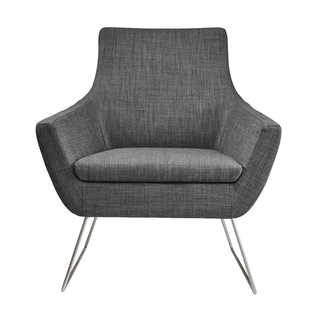 An open, reclined shape with thin, brushed steel legs, this chair lightens up contemporary style with airy ambiance. Smooth clean lines are both modern and industrial. The beauty of this collection lies in its simplicity. Rich texture in a woven dark charcoal grey 100% polyester fabric provides an interesting variation to the sleek, smooth steel base. With an interior seat width of 22.5", a seat depth of 21", and seat back height of19.5", this Chair is a spacious and cozy option. Overall dimensions are 33"W x 30.5"D x 37"H.