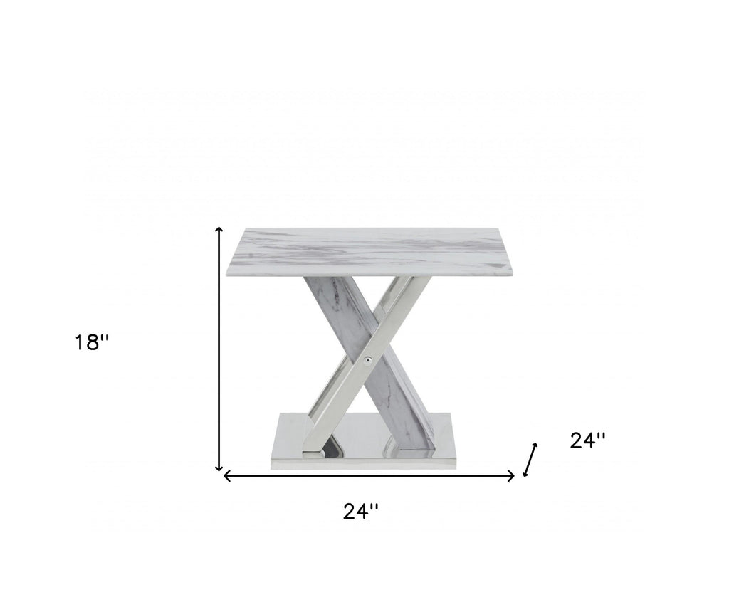 An elegant marble with this stunning yet practical glass-top end table. It include an x-base design with polished stainless steel accents. This table offers plenty of style and will be the focal point of your living space.