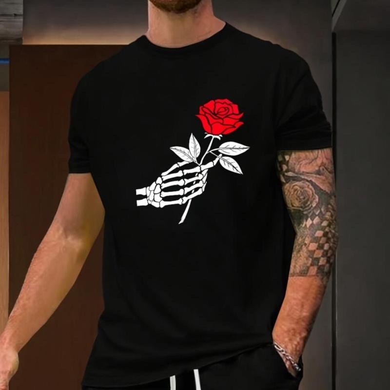 Hand With Rose Print Men's Short Sleeve T-shirt Casual Sports Regular Top For Spring Summer Made in USA