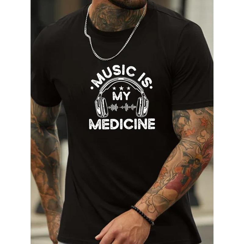 Headphone Pattern And Letter Print "MUSIC IS MY MEDICINE" Crew Neck And Short Sleeve T-shirt, Casual And Chic Tops For Men's Summer Leisurewear Made in USA