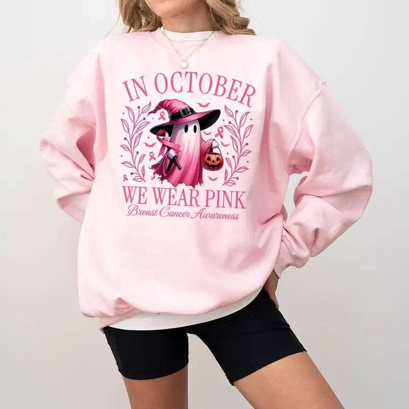 In October We Wear Pink Ghost Sweatshirt, Halloween Ghost Sweatshirt, Pink Ribbon Shirt, Breast Cancer Awareness Sweatshirt, We Wear Pink, Halloween Shirt