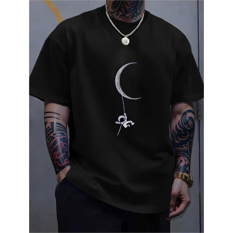 Men's Moon Astronaut Print T-Shirt - Casual Cotton Crew Neck Tee for Summer, Outdoor & Vacation Wear Made in USA