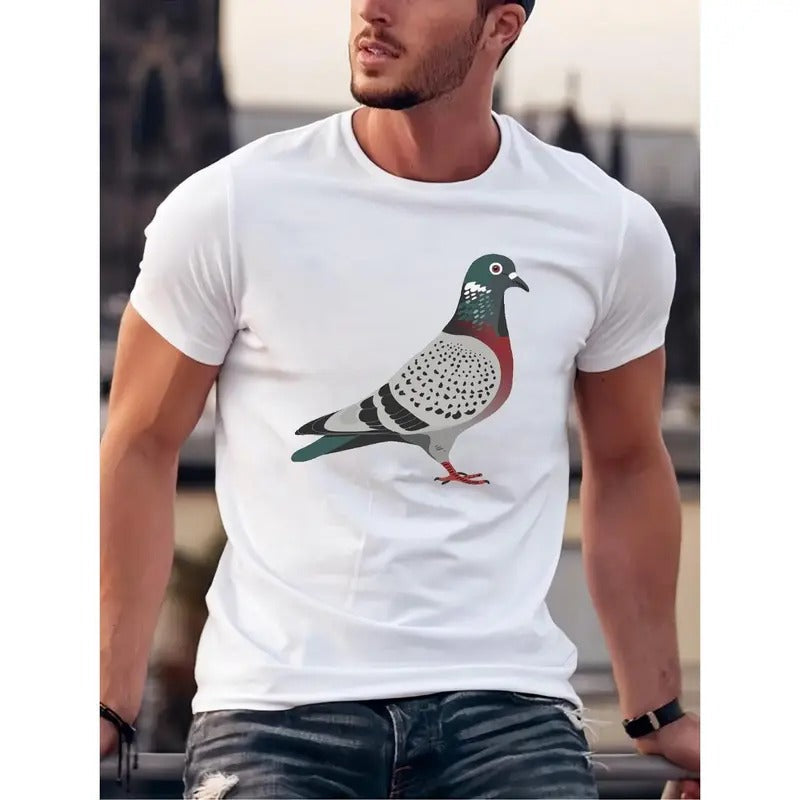 Men's Pigeon Print T-shirt, Casual Comfy Slightly Stretch Crew Neck Tee, Men's Clothing For Summer Outdoor Activity Made in USA