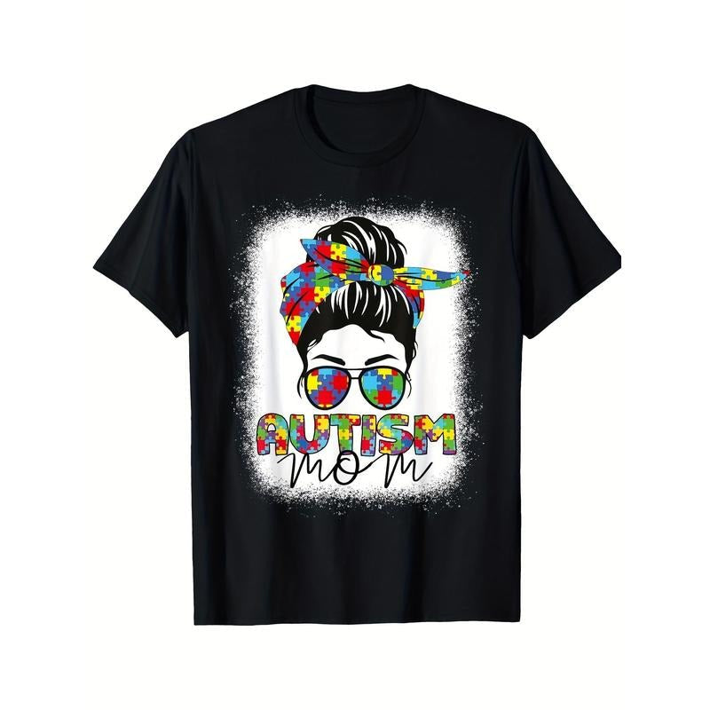[Messy Bun Autism Mom] Mothers Day Autism Mom T-Shirt 2024 - Messy Bun Bleached Printed Pattern - Black Casual Blazer Short Sleeve Men Sports Made in USA