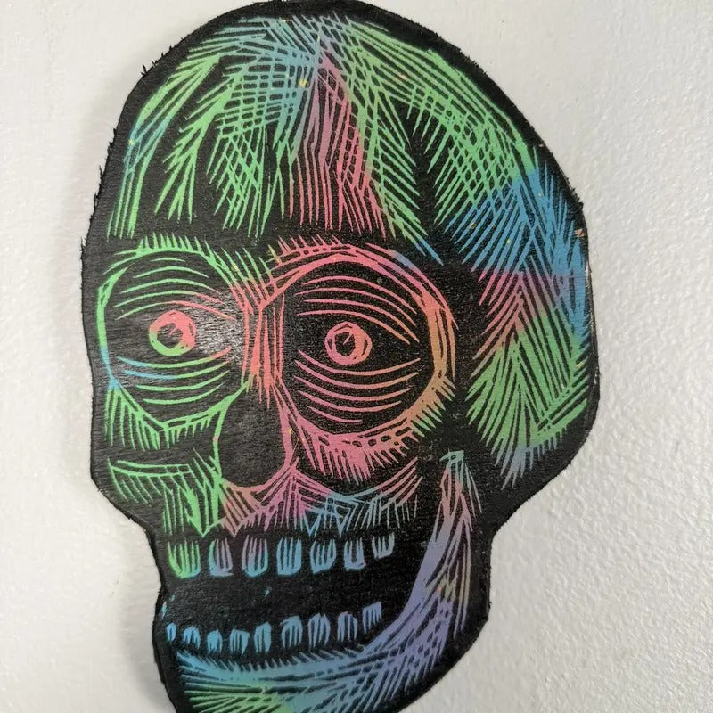 Mini Skull ( 6" x 8") Woodcut Printed on Painted and Shaped Wooden Panels 6" x8" Decor Wall