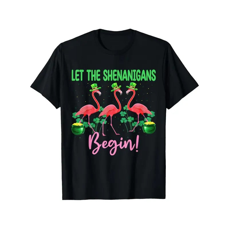 [St Patricks Day T-Shirt] St Patricks Day Unisex Cotton Let The Shenanigan Begin Flamingo Leprechaun T-Shirt, 100% Cotton, S-XXXL, Slight Stretch, Slightly Elastic, Short Sleeve, Round Neck, Outdoor, Casual Made in USA