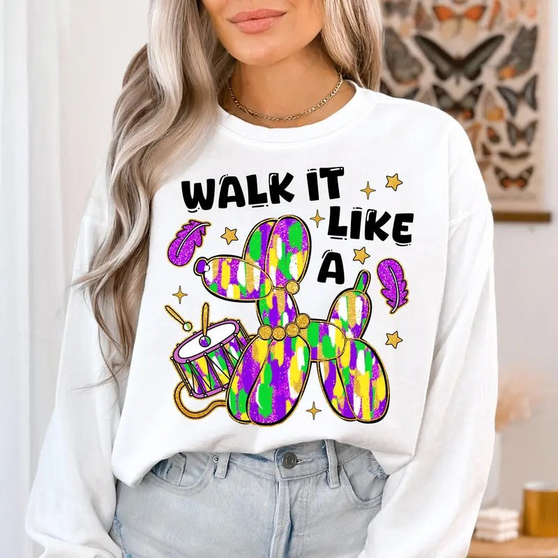 Walk It Like A Dog Mardi Gras Tshirt Sweatshirt, Glitter Mardi Gras Shirt, Fleur De Lis Shirt, Coquette Bow Tee, Unisex Sweater Pullover Tee