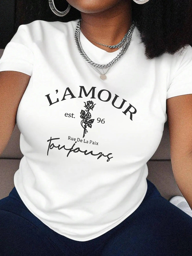 Women's Floral & Letter Print Round Neck Tee, Fashion Casual Crew Neck Short Sleeve T-Shirt for Daily Holiday Vacation Outdoor Wear, Ladies Clothes for All Seasons