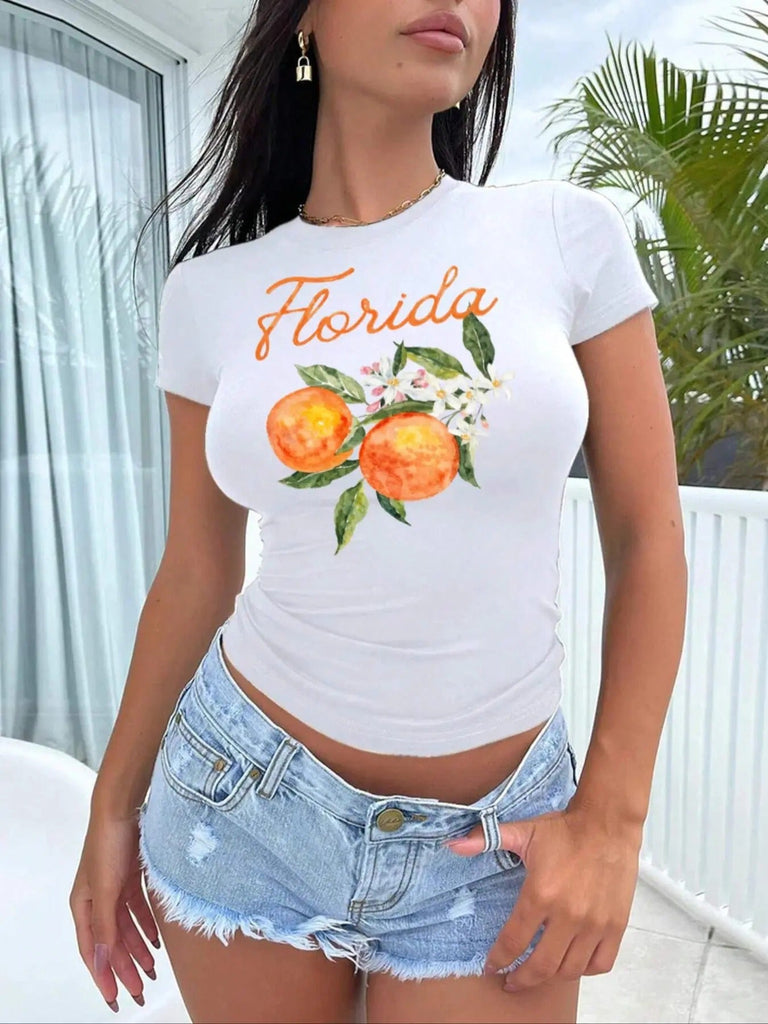 Women's Letter & Orange Print Round Neck Tee, Casual Short Sleeve Crew Neck T-Shirt for Summer, Fashion Women's Top for Daily Wear