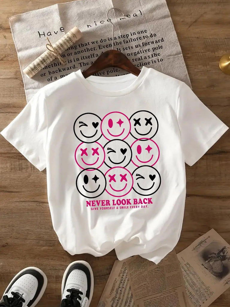 Women's Letter & Smile Face Print Round Neck Tee, Fashion Casual Crew Neck Short Sleeve T-shirt for Daily Holiday Vacation Outdoor Wear, Ladies Clothes for All Seasons